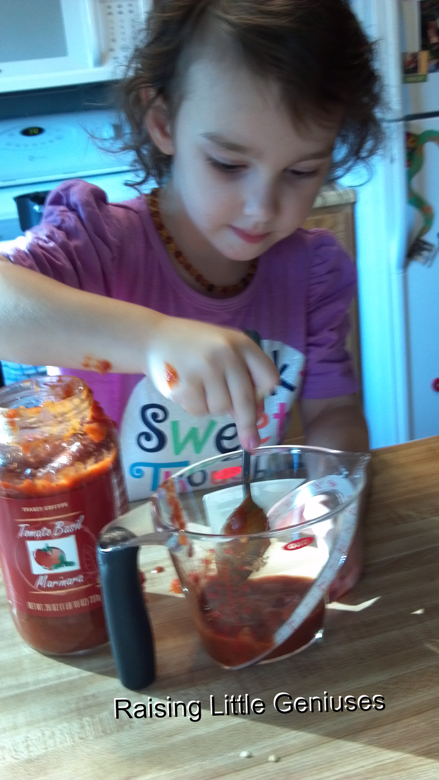 Next it came time to measure out the sauce. I didn't want her to pour it from the jar because there was a lot in the jar, it was heavy, and I didn't want it all pouring out at once. So I gave her the measuring cup and a spoon and showed her the line for how much we needed. She spooned it into the measuring cup until she had the right amount. This is itself is a lesson about the kitchen and life skill of measurement.